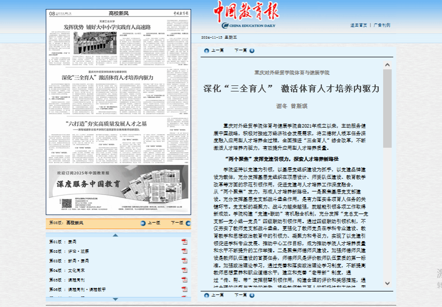 《中国教育报》报道新葡的京集团3522体育与健康学院 深化“三全育人” 激活体育人才培养内驱力