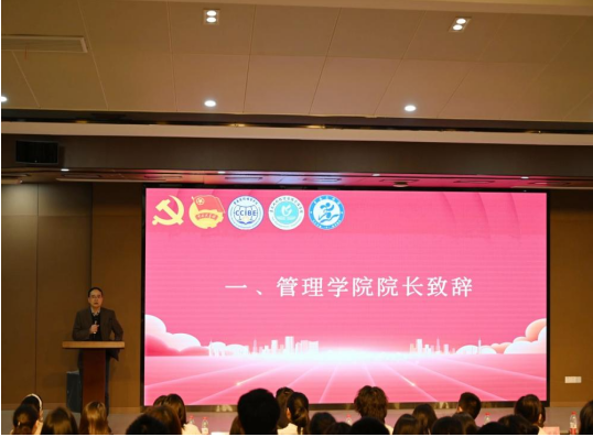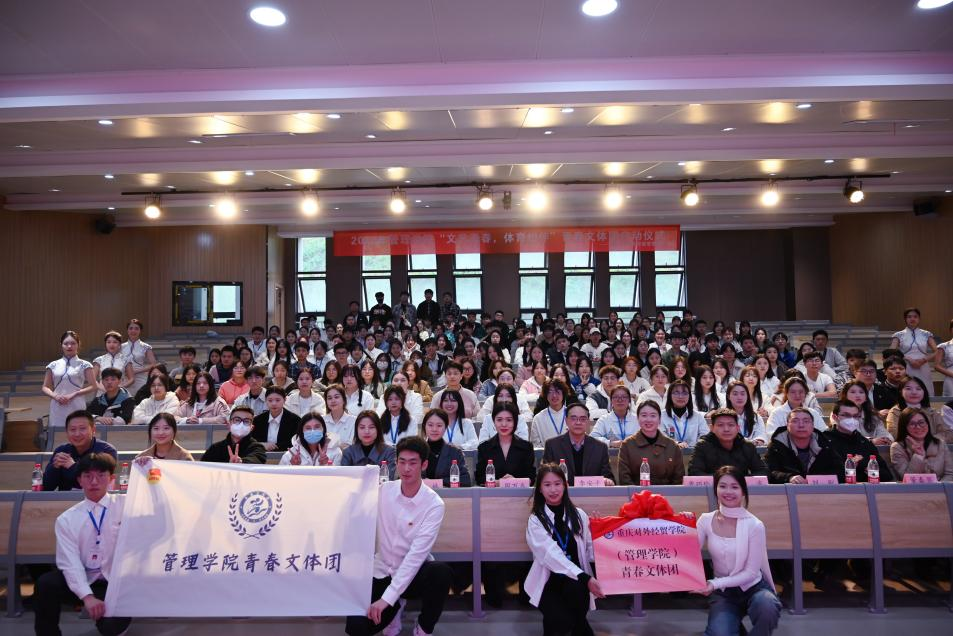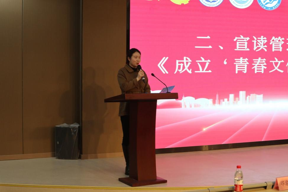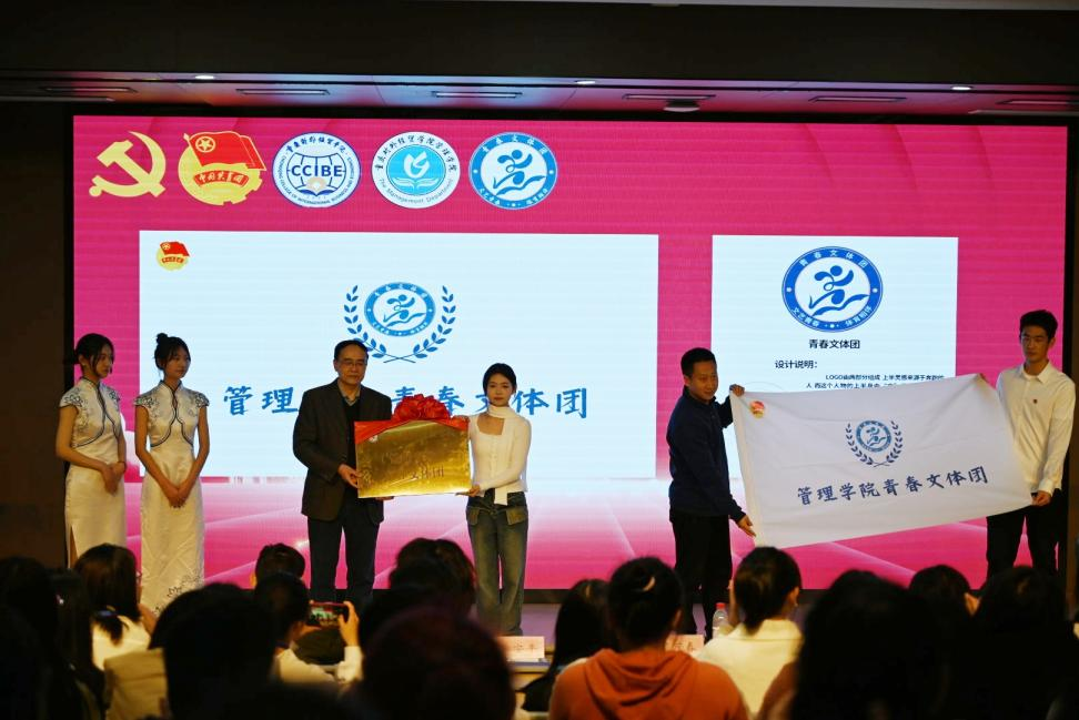 管理学院团总支书记曹巧玲老师宣读管理学院关于《成立‘青春文体团’的通知》,李安平院长和周万春书记为“青春文体团”揭牌、授旗,以示“青春文体团”正式成立。