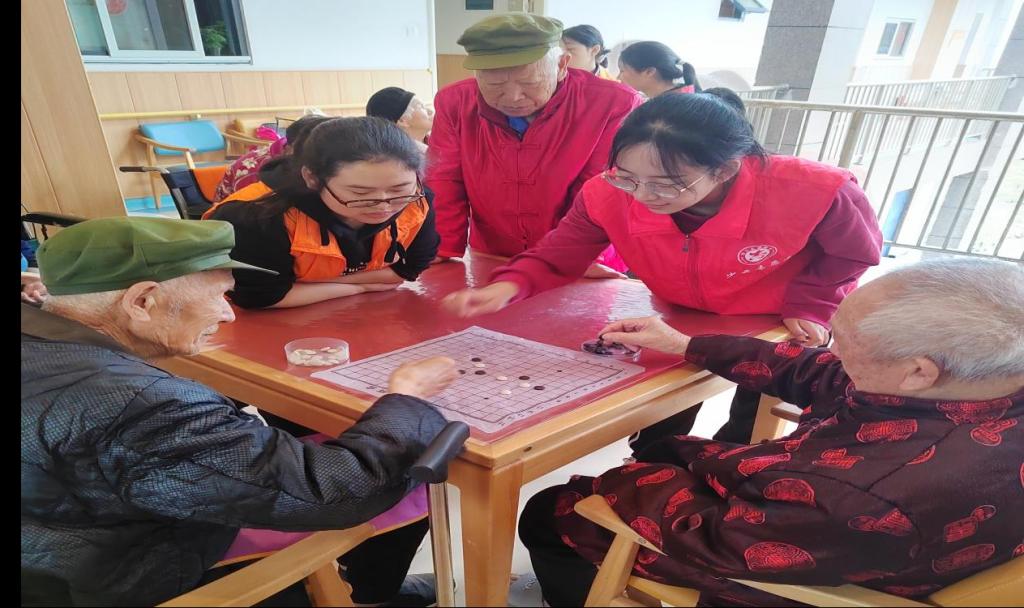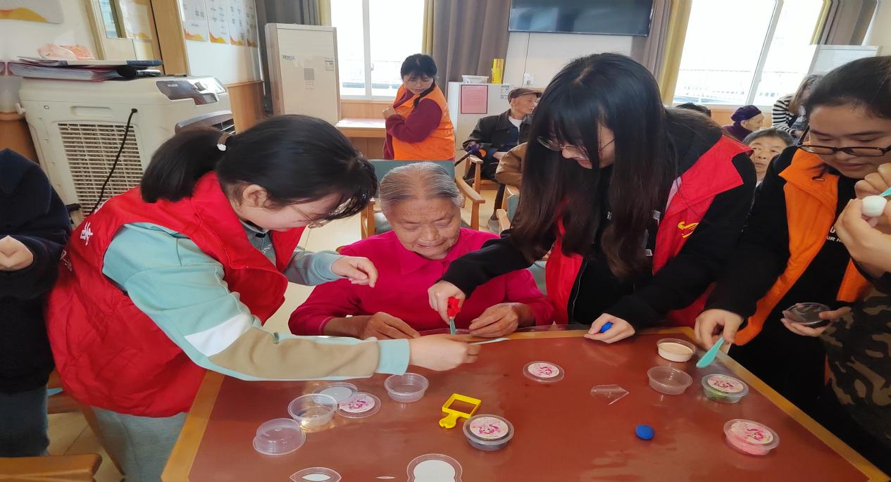 活动伊始,由活动负责人带领志愿者们对养老院长者表示慰问以及介绍活动流程。接着,志愿者们与老人促膝长谈,不仅拉进了志愿者与老人们的关系,也给老人们带来心灵的慰藉。随后,曾小敏、熊春雪等九名志愿者带来舞蹈《美丽中国》,伴随着音乐声,老人们举起双手舞动,释放着手指灵活度。然后,由汪思宇、付宛心等十名志愿者带来舞蹈《护花使者》,志愿者积极地与老人们互动,欢乐的氛围一直延续到表演结束。精彩的表演结束后,志愿者和老人们合唱经典红歌《映山红》,激扬高亢的歌声唱响峥嵘岁月。在接下来的活动中,志愿者们陪伴老人进行黏土手工制作和下五子棋游戏。在志愿者们细心的指导下,老人们发挥自己的想象力,捏出的物品,个个栩栩如生。整个养老院充满热闹与温馨的氛围。快乐的时光总是过的很快,志愿者们与老人们合影留念后,本次志愿服务活动也接近了尾声,志愿者们依依不舍地与老人们告别。