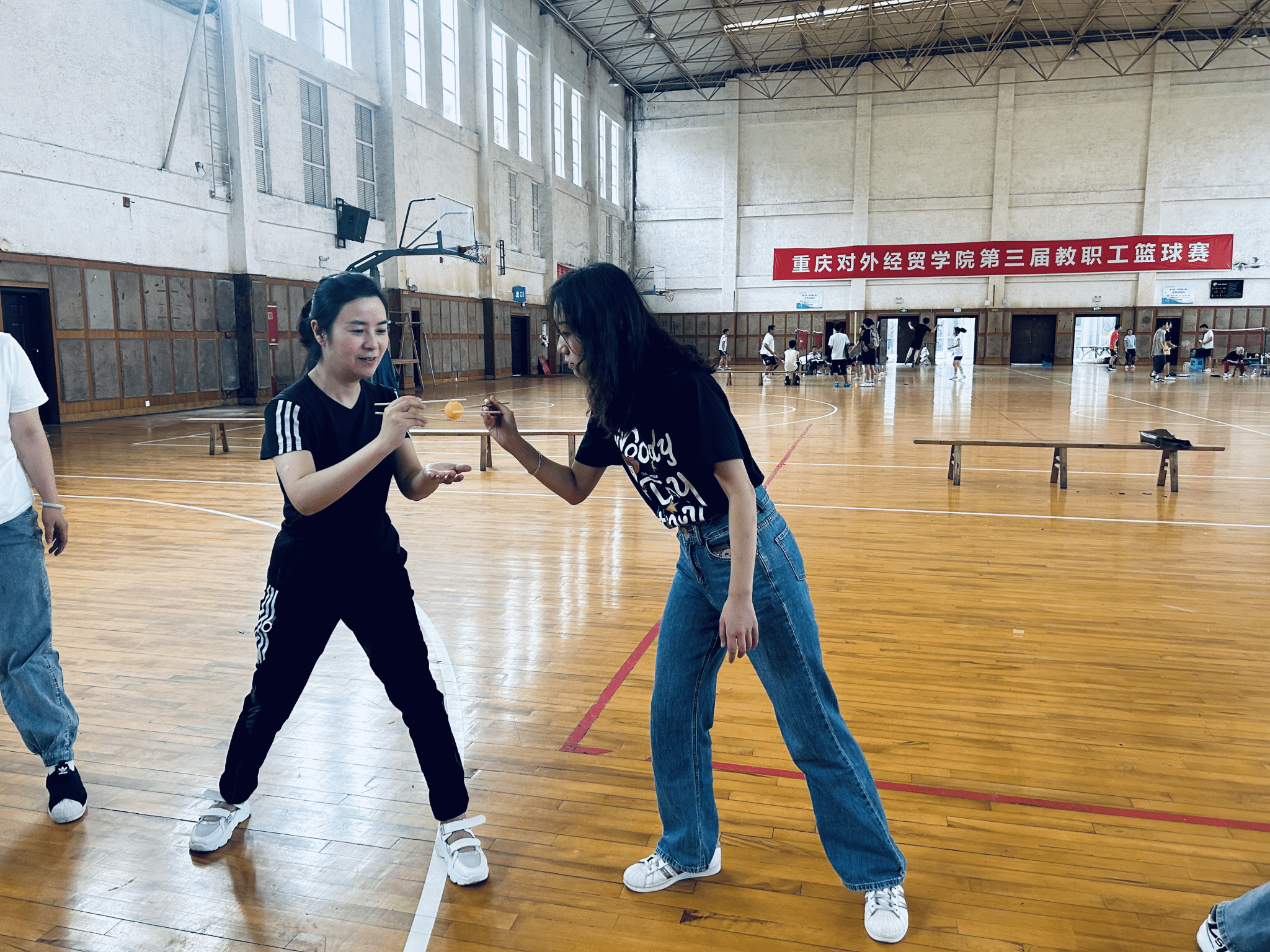 活动中老师们欢声笑语,气氛活跃。本次活动共设“筷”乐传递、“篮”不倒你、你比划我猜三个游戏项目。所有教职工分为四个小组,以小组为单位,全员参与游戏,游戏过程中,老师们排兵布阵,团结协作,彰显出跨商教师风采。