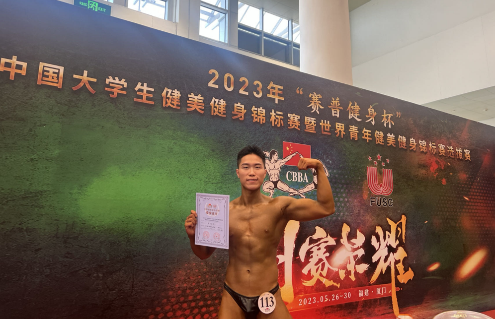 2023年“赛普健身杯”中国大学生健美健身锦标赛暨世界青年健身健美锦标赛选拔赛于2023年5月26日—30日在福建厦门举行,学院2020级休闲体育专业学生周林坷(113号)在此次比赛中获得男子传统健美75公斤级第五名。