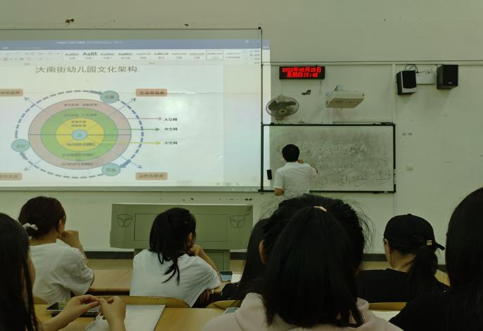 最后杨雄老师讲到了课程的设计,以它设计的“渡美”课程为例为同学们进行了讲解和分享。有了主题同学们便能根据幼儿发展指南设计五大领域七大区域活动教育。课程开展以来,老师激情讲授,同学们积极交流。许多同学都表示今天的课程使自己受益匪浅,对幼儿园管理的认识又深刻了许多。