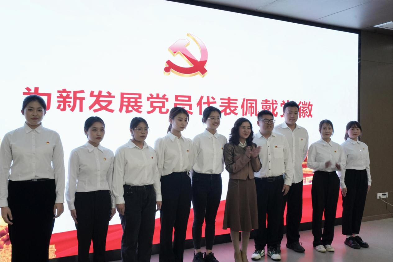 首先,活动开始,全体起立,齐唱《国际歌》,随后党总支组织员刘坤奇同志宣读新发展党员批复,并由学院院长、党总支纪检委员赵逖同志为新发展党员代表佩戴党徽。