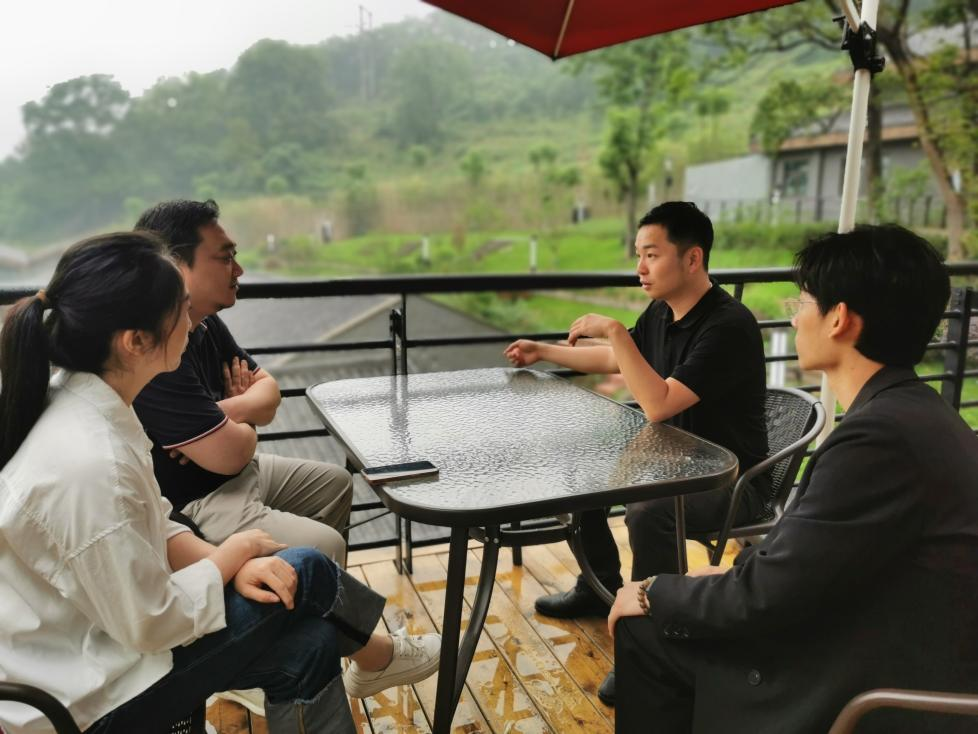 随后,影视融媒体学院一行人与《红岩红》项目负责方蓝海众浪文化科技(成都)有限公司教育投资部副总裁秦立栋以及剧目负责人展开交流。