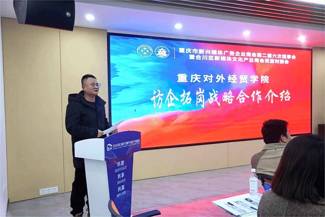 为深化产教融合、校企合作,进一步拓宽艺术设计学院访企拓岗渠道,帮助学院毕业生拥有更多更好就业机会和就业岗位,2024年1月5日16时,学院副院长马乐、就业联络员周小杰受邀前往合川区现代服务产业园参加重庆市新兴媒体广告企业商会第二届六次理事会暨合川区新媒体文化产业商会资源对接会。