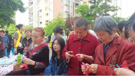 “最美记忆”:居民们在摊位上选择自己喜欢的配饰,摆出自己喜欢的姿势,志愿者用相机为社区居民留下最美的纪念。