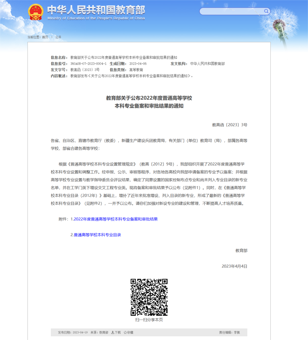 近日,教育部公布了2022年度普通高等学校本科专业备案和审批结果(教高函〔2023〕3号),学校申报的虚拟现实技术、区块链工程、音乐教育三个本科专业全部成功获批。截至目前,学校本科专业已增至51个,涵盖经济学、管理学、文学、理学、工学、艺术学、教育学7大学科门类。