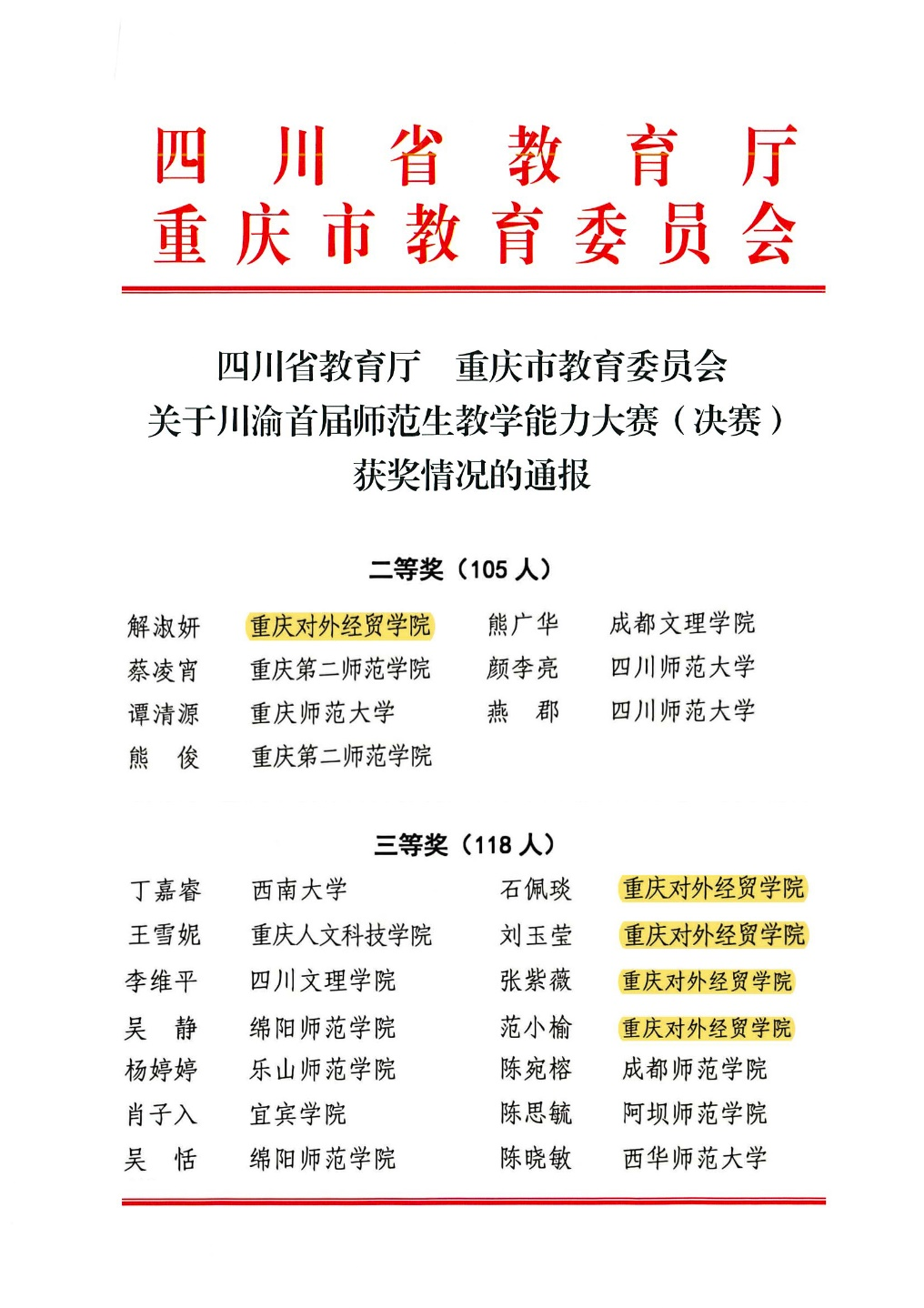 由四川省教育厅、重庆市教育委员会主办的川渝首届师范生教学能力大赛决赛结果已公布。新葡的京集团5名决赛选手全员获奖。